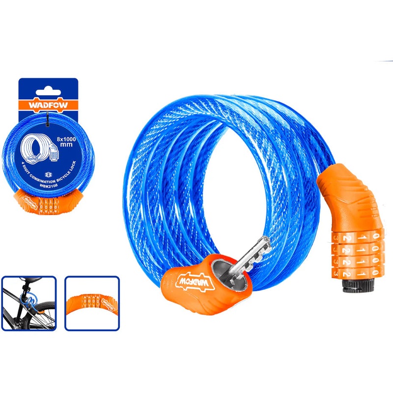 Wadfow 4-Digit Combination Bicycle Cable LockModel: WBK21084 Digit combination bicycle cable lockLength: 1000mmDiameter: 8mmMaterial: PVC,wirerope, ABS casePVC coated braidedHigh quality wire rope4-digits combination lockCan be rolled up for easy storageId