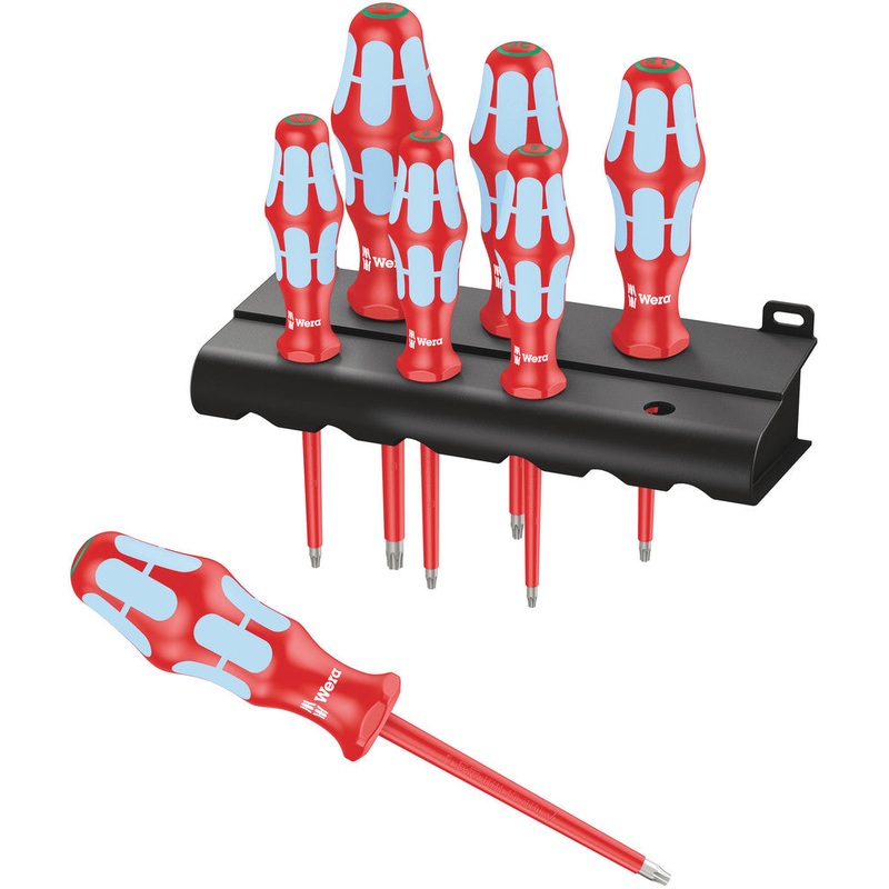 Kraftform Stainless VDE: The safety screwdriver for stainless steel couplings. Plus rack. With Take it easy tool finder: Colour coding by profile and size stamping.Application:TORX socket screwsDesign: 7-piece set in a box plus rackTechnical Specifications