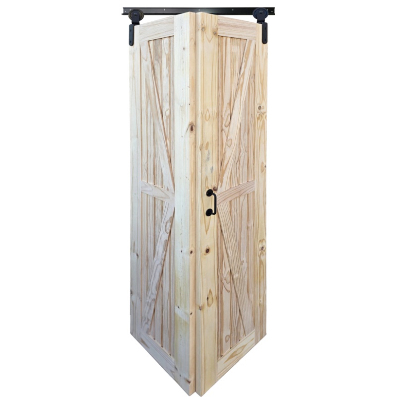 X-Braced Pine Bifold Door | Rustic Farmhouse StyleAdd a touch of rustic charm and space-saving efficiency to your home with our X-Braced Pine Bifold Door. Crafted from natural, unfinished pine, this door features a distinctive "X" brace design, reminiscent